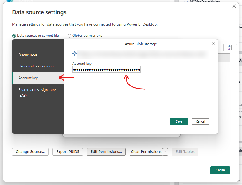 noteYou only need to specify this Account key once; Power BI will remember it in subsequent reports which also use this Azure Storage Account as a data source.