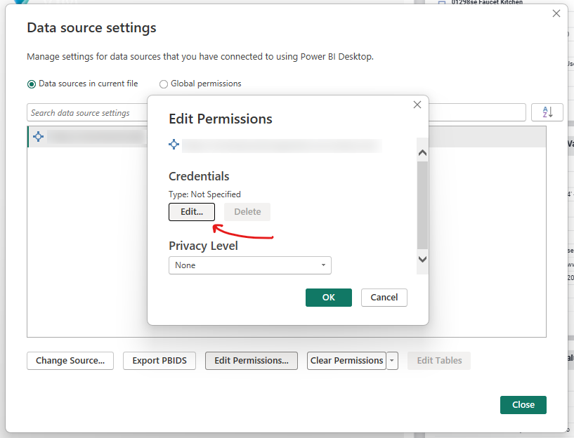 Click on the dropdown arrow under "Transform Data" and select "Data Source settings"